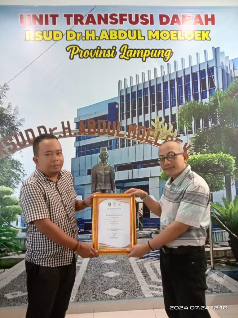 Bandar Lampung: Pejuang kemanusiaan Lampung terima piagam penghargaan sebagai Duta Darah Aperesis RSAM Bandar Lampung Penghargaan ini diberikan kepada M.Arif Sanjaya karena telah sukarelela menyumbangkan darahnya di UTD Bank Darah RSAM Bandar Lampung.