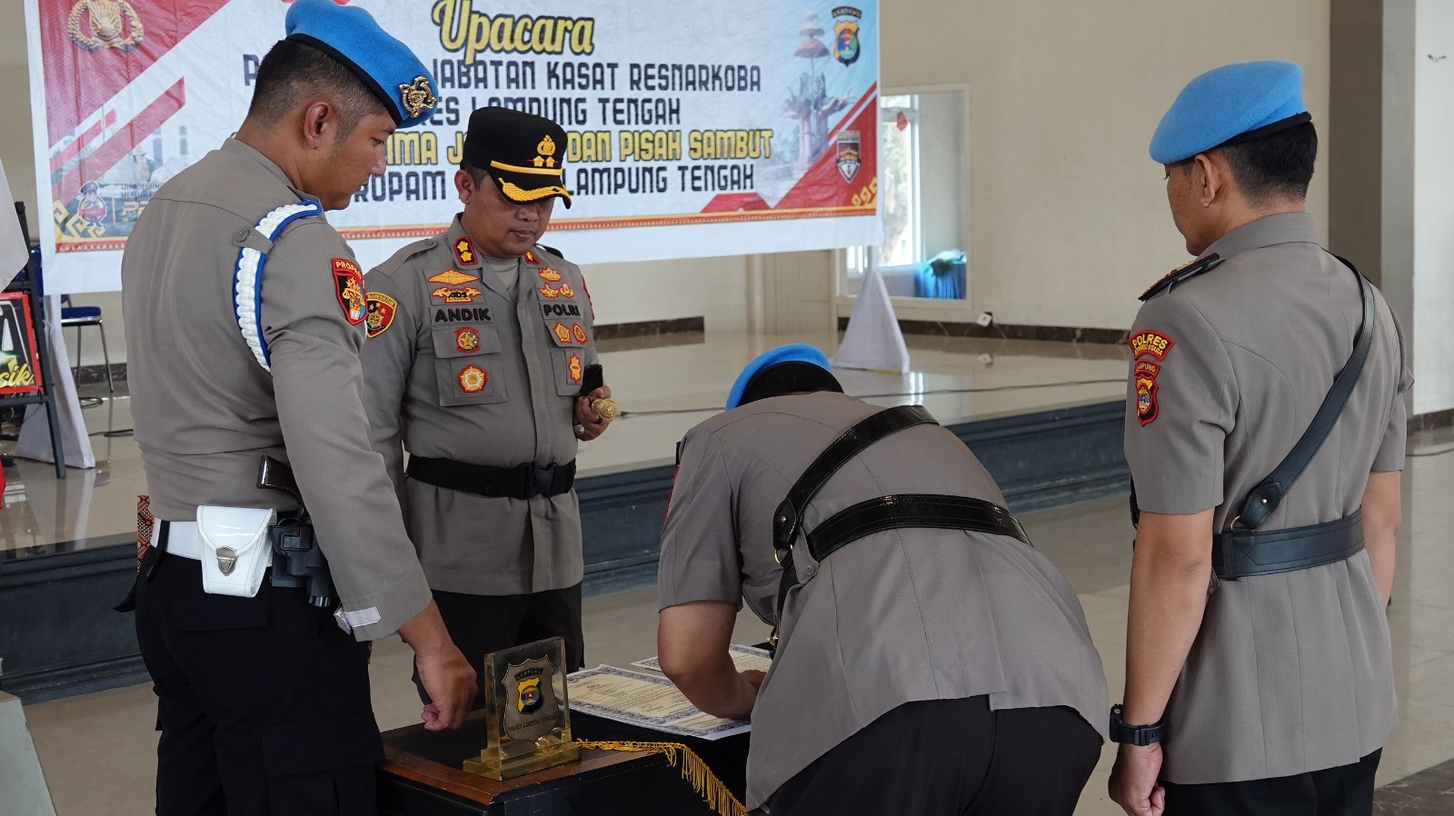 Lampung Tengah: Kapolres Lampung Tengah, Polda Lampung AKBP Andik Purnomo Sigit, S.H., S.I.K., M.M memimpin langsung upacara Pelantikan Jabatan Kasat Res Narkoba, serah terima jabatan (Sertijab) dan pisah sambut Kasi Propam di aula Atmani Wedhana Mapolres setempat. Rabu (21/8/24) pukul 14.00 WIB.