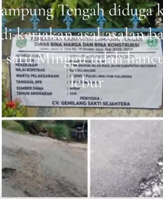 Lampung Tengah: Masyarakat Kampung Nyukang Harjo, Kecamatan Selagai Lingga, kabupaten Lampung Tengah, mendesak agar pekerjaan proyek peningkatan jalan di wilayah mereka segera dibongkar total dan dikerjakan ulang. Warga menilai kualitas pekerjaan jalan tersebut diduga dikerjakan asal jadi dan tidak sesuai dengan spesifikasi teknis Dan Rab. Rabu, 07-01-2025.