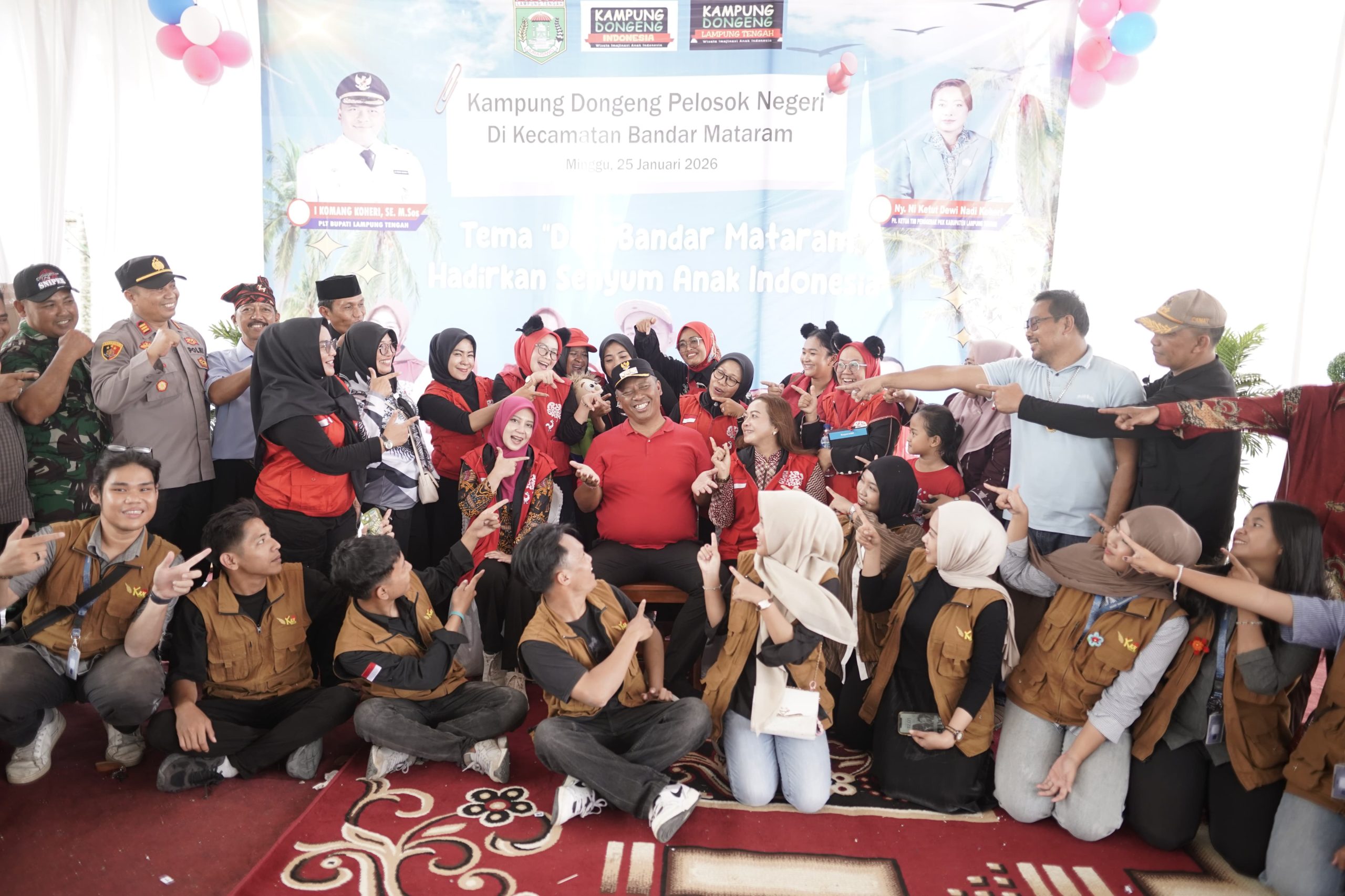 Lampung Tengah: Pelaksana Tugas (Plt) Bupati Kabupaten Lampung Tengah I Komang Koheri didampingi Pelaksana Tugas (Plt) Ketua TP PKK yang juga Plt Bunda Literasi Kabupaten Lampung Tengah Ni Ketut Dewi Nadi Komang Koheri secara resmi membuka kegiatan Kampung Dongeng Pelosok Negeri yang berlangsung di Kecamatan Bandar Mataram, Minggu (25/01/2026).